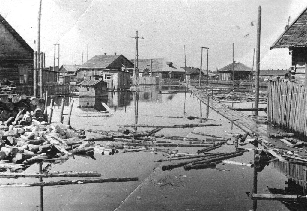 Поселок Курдюг, центральная часть. Наводнение 1966 года. На переднем плане справа угол дома, где в это время жили Виноградовы, Ивановы, Ханины, Медведевы. Слева угол дома, где жили Утышевы, Околовы, Кудряшовы, Дугаевы.