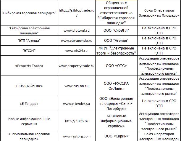 Актуальную информацию по списку площадок можно получить на сайте федресурса https://bankrot.fedresurs.ru/TradePlaceList.aspx