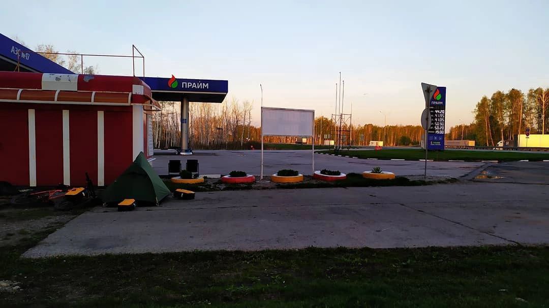 Я поставил палатку на АЗС рядом с вагончиком, куда периодически приходил работник заправки. Примерно в 70м от меня моего ночлега уже проходила федеральная трасса, по которой постоянно проезжали машины.