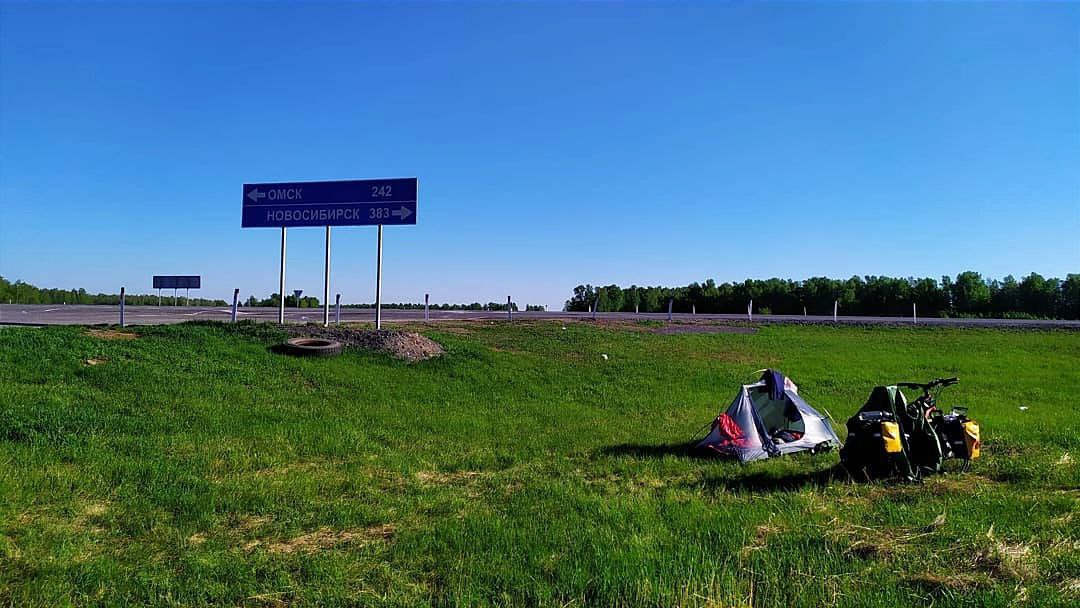 Поставил палатку прямо в поле, недалеко от трассы. Буду спать максимально долго, организму необходимо хорошенько восстановиться.