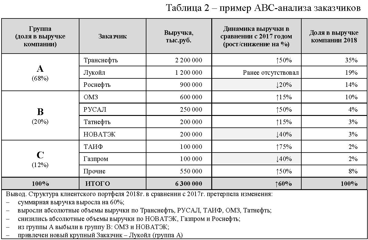 Далее проводится анализ фактической выручки компании в разрезе заказчиков за два предыдущих отчетных календарных периода (АВС-анализ, табл.2). Выявляется группа ключевых заказчиков (группы А и В), сопоставляется динамика их доли выручки в портфеле компании, объемов работ и инвестиций на рынке. Анализируются причины разницы темпов изменений (при наличии). Анализируется динамика А и В групп заказчиков, причины изменений, достаточность диверсификации портфеля выручки.