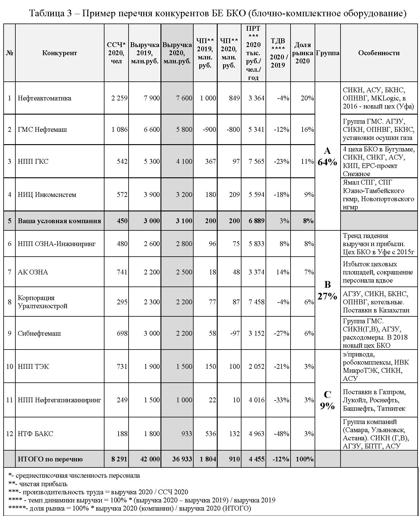 Корректнее формировать перечни Ваших фактических конкурентов по их участию в Ваших реальных тендерах (исходя из принципов практической, а не теоретической конкуренции). Так создается и ежегодно актуализируется перечень основных конкурентов по каждому рынку ключевых продуктов (бизнес-единице). Затем, в апреле (в это время в сети Интернет становятся доступными свежие сведения Росстата и ФНС – в поисковых системах СБИС, Контур.Фокус, СПАРК и пр.) однократно собираются сведения выручки, прибыли и среднесписочной численности персонала, новостей по каждому конкуренту (запуск новых продуктов, мощностей, участие в VIP-проектах и пр.).