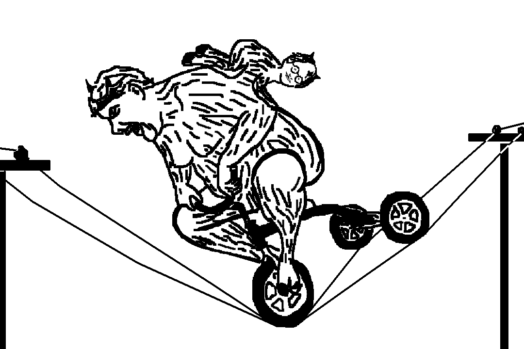 Оба преклонили было колени, но воздев очи к небу, обнаружили, что источником звукового хаоса был не кто иной, как непозволительно громадный человек на чём-то непонятном, мчащийся по проводам похлеще всякого канатоходца. Ощущение было, что он передвигается вприсядку, перебирая руками и ногами, подобно гигантской горилле.