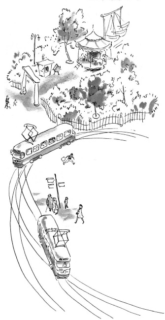 Он всё думал про бедного Рича, пока шёл рядом с отцом к трамвайной остановке. И вот, сверкающий и нарядный, подлетел к ним трамвай, прозвонил: трень-брень!.. Хотя этот жёлто-красный трамвай и казался беззаботным, катил себе по рельсам, на самом деле у него было много хлопот: пассажиры, светофоры, пешеходы, автомобили. Трамвай довёз Максима до парка и умчался. Папа нажал пальцем Максимкин нос: «Трень!..» И где-то вдалеке тотчас отозвался трамвай: брень!..