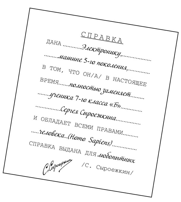 «Первое место занял ученик девятого класса Сергей Сыроежкин. Почёт и слава!..»