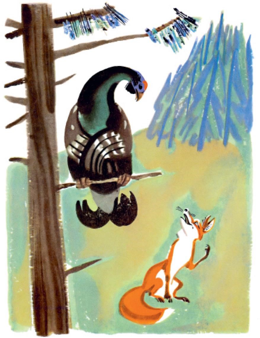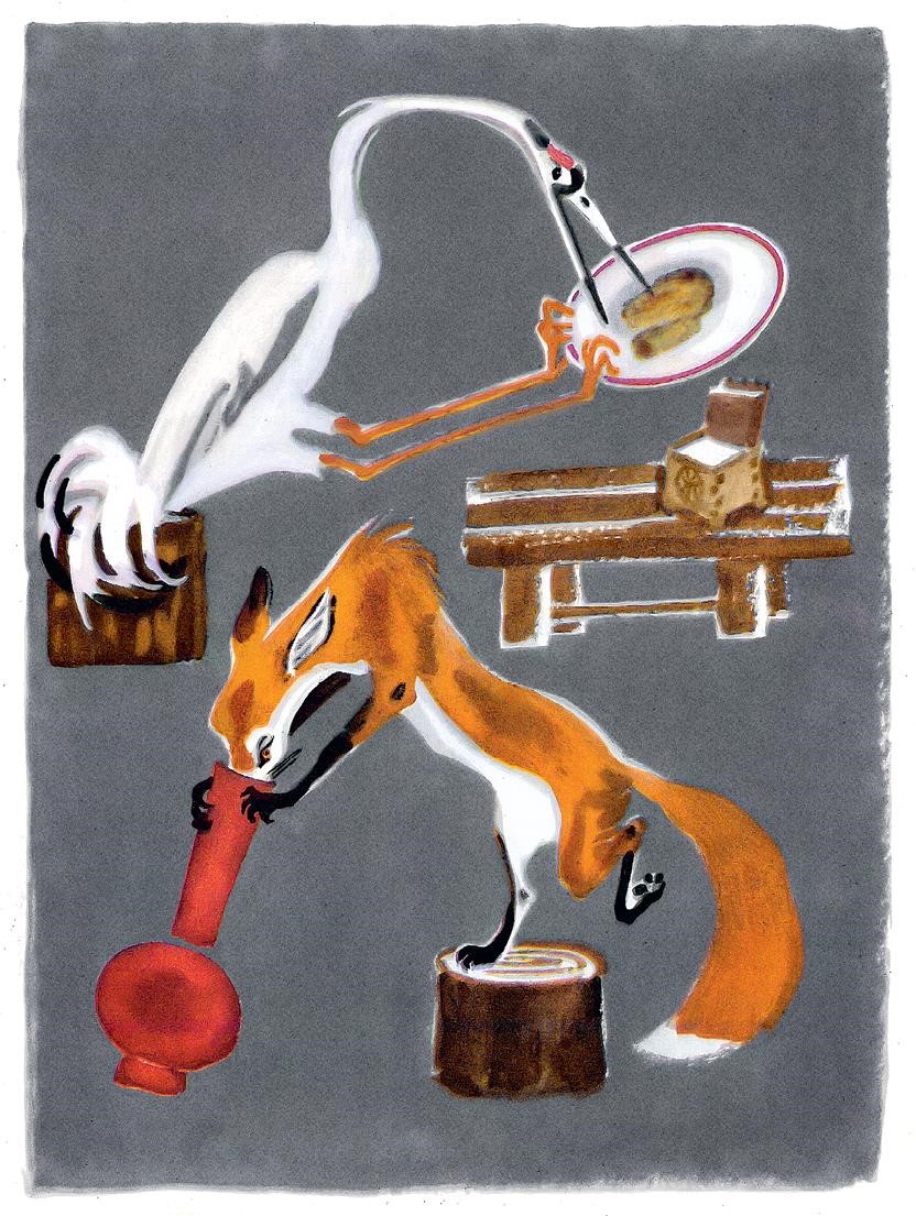 Лисица позвала журавля на обед и подала похлёбку на тарелке. Журавль ничего не мог взять своим длинным носом, и лисица сама всё поела. На другой день журавль к себе позвал лисицу и подал обед в кувшине с узким горлом. Лисица не могла продеть морду в кувшин, а журавль всунул свою длинную шею и всё выпил один.