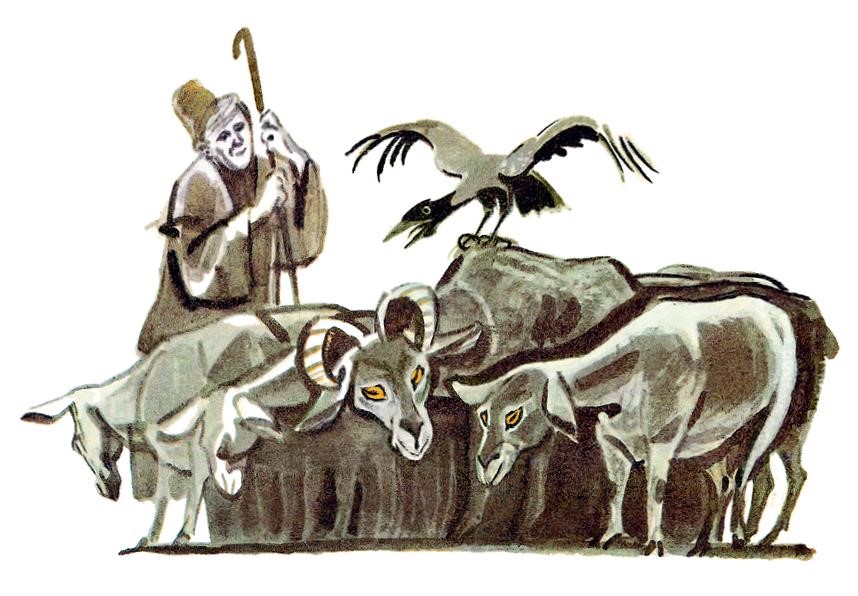 Ходили овцы по полю. Откуда ни взялся орёл, – упал с неба, вцепился когтями в ягнёнка и унёс его. Ворона видела это и хотела тоже мяса поесть. Она сказала: «Это не хитрая штука. Дай я тоже сделаю, да ещё лучше. Орёл глуп, он малого ягнёнка взял, а я вон того жирного барана выберу». Взялась барану ворона когтями прямо в волну, хотела поднять – не может. И не знает ворона, как самой из волны когти выдрать. Пастух пришёл, выдрал вороне ноги из волны, убил её и бросил.