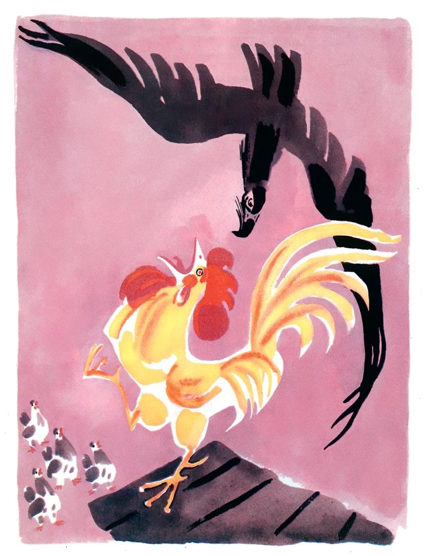 Не успел пропеть, летит орёл, сбил петуха, схватил в когти и унёс в своё гнездо.