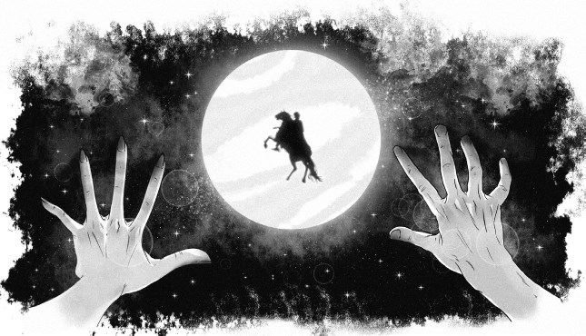 Внезапно в этой непроглядной тьме ярко вспыхнуло что-то вдалеке. Первый луч света озарил непроглядную тьму. Потом ещё и ещё, и конь прыгнул, он, словно обезумевший, стал играть с этими светящимися шарами, расставлять их в разные узоры, орнаменты. Конь искал гармонию.