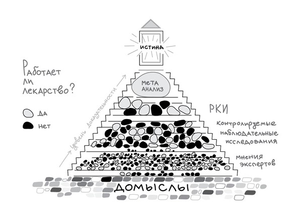 Вот так выглядит путь к истине. В этом примере мы задались вопросом, эффективно ли лекарство. Здесь мы видим уровни доказательности: самое меньшее доверие вызывают мнения отдельных врачей – экспертов. В зависимости от их образования и статуса, эти мнения могут иметь больший или меньший вес (видите, камушки разные, но все равно весьма мелкие). Выше идут исследования низкой доказательности, без рандомизации. Еще выше – РКИ, то есть рандомизированные контролируемые исследования. Исследования тоже могут быть разного размера, например моноцентровые – в одной больнице – или многоцентровые – в множестве больниц. Как вы видите, на трех нижних этапах ответы на один и тот же вопрос могут быть противоположными. И наконец на верхнем уровне – метаанализ, то есть сбор всех качественных исследований и выведение ответа из огромного массива данных. В нашем случае оказалось, что лекарство работает.