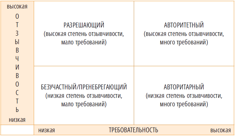 Каждый из трех стилей воспитания оценивался по степени требовательности (также называемой контролем, наставлением или ожиданиями) и отзывчивости (или, по-другому, поддержки, понимания или теплоты). Первый стиль она назвала разрешающим. Он подразумевает много теплоты и почти полное отсутствие требовательности. Такие родители любят и поддерживают детей, позволяя им делать практически что угодно. Они поощряют в ребенке умение формировать и отстаивать собственное мнение, стараются выстроить с ним демократичные отношения. Противоположным разрешающему является авторитарное воспитание. В данном случае родители ждут от ребенка самых высоких достижений, но в общении с ним крайне сдержанны. Авторитарные родители предъявляют высокие «требования зрелости». Они заставляют детей строго придерживаться установленных правил и наказывают за их нарушение, не особо разбираясь в причинах такого поведения. Между этими двумя крайностями есть золотая середина, которая называется авторитетным стилем воспитания. На письме слова «авторитарный» и «авторитетный» различаются всего несколькими буквами, но именно они указывают на совершенно разный подход к воспитанию. Авторитетные родители возлагают большие надежды на своих детей, при этом оказывая им всю необходимую эмоциональную поддержку. Авторитетное воспитание сочетает в себе, с одной стороны, теплоту/поддержку/отзывчивость, а с другой – наставления/ожидания/требовательность. Авторитетные родители ждут от детей зрелого и разумного поведения и дают им для этого все, что нужно. Им небезразличны мысли и чувства ребенка и то, почему он поступает так, а не иначе. Но главными в семье являются именно родители. Позднее исследователи выделили и четвертый стиль воспитания – безучастный, или пренебрегающий. Его отличают высокая холодность и низкий уровень ожиданий. В таблице ниже сведены все стили воспитания.