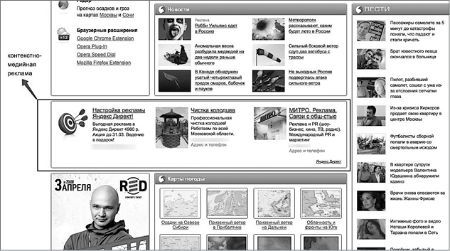 Контекстно-медийная реклама – объявления на сторонних сайтах – партнёрах поисковых систем. Их видят те, кто ранее интересовался данной тематикой (ты наверняка замечал такое: ищешь в Яндексе ноутбук, и он начинает преследовать тебя везде). Также объявления показываются в контексте тематики конкретного сайта. К примеру, на блоге о туризме могут появляться объявления, призывающие поехать отдохнуть. Это контекстная реклама в изначальном её виде: она соответствует контексту, который её окружает.