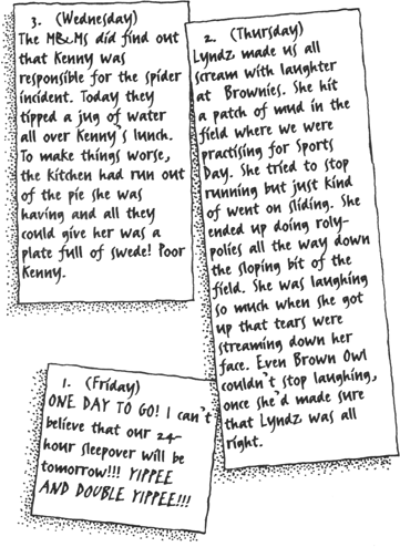 “The sleepover’s on for Saturday the 6th,” she shrieked, jumping up and down on the spot. Lyndz, Fliss and me screamed and did high fives.
