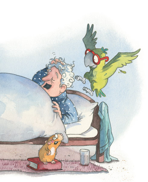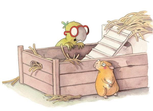 – Чего тебе? – проскрежетал с жёрдочки Хорн и посмотрел вниз. В лунном свете, падавшем из окна, он увидел на полу свою подружку, морскую свинку Никель. Попугай достал правой лапой из-под крыла свои массивные очки в роговой оправе чёрного цвета, провёл по стеклам разок перьями и нацепил на клюв. Теперь он уже хорошо видел морскую свинку. И ему показалась, что она чем-то огорчена.