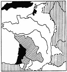 Рис. 1.1. Английские владения во Франции в 1337 г. (показаны черным цветом) и в 1360 г. (косая штриховка). Буквой К обозначен порт Кале /1/.