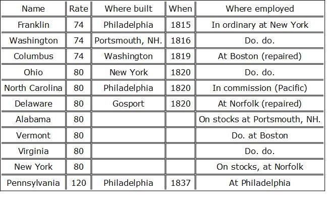 The ratings of these vessels will, however, very much mislead people as to the real strength of the armament. The 74’s and 80’s are in weight of broadside equal to most three-decked ships; the first-class frigates are double-banked of the scantling, and carrying the complement of men of our 74’s. The sloops are equally powerful in proportion to their ratings, most of them carrying long guns. Although flush vessels, they are little inferior to a 36-gun frigate in scantling, and are much too powerful far any that we have in our service, under the same denomination of rating. All the line-of-battle ships are named after the several states, the frigates after the principal rivers, and the sloops of war after the towns, or cities, and the names are decided by lot.