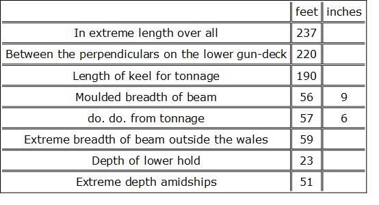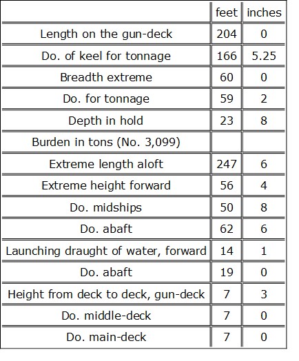 The Americans considered that in the Pennsylvania they possessed the largest vessel in the world, but this is a great mistake; one of the Sultan’s three-deckers is larger. Below are the dimensions of the Queen, lately launched at Portsmouth