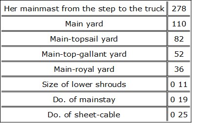 The number of yards of canvass for one suit of sails is 18,341, and for bags, hammocks, boat-sails, awnings, etcetera, 14,624; total 32,965 yards.