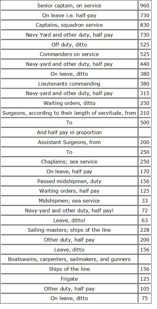 The pay of these officers is on the following scale. It must be observed, that they do not use the term “half pay;” but when unemployed the officers are either attached to the various dockyards or on leave. I have reduced the sums paid into English money, that they may be better understood by the reader: