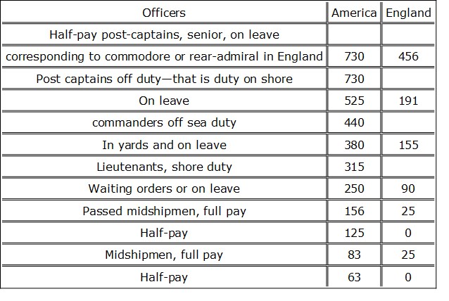 It will be perceived by the above list how very much better all classes in the American service are paid in comparison with those in our service. But let it not be supposed that this liberality is a matter of choice on the part of the American government; on the contrary, it is one of necessity. There never was, nor never will be, anything like liberality under a democratic form of government. The navy is a favourite service, it is true, but the officers of the American navy have not one cent more than they are entitled to, or than they absolutely require. In a country like America, where any one may by industry, in a few years, become an independent, if not a wealthy man, it would be impossible for the government to procure officers if they were not tolerably paid; no parents would permit their children to enter the service unless they were enabled by their allowances to keep up a respectable appearance; and in America everything, to the annuitant or person not making money, but living upon his income, is much dearer than with us. The government, therefore, are obliged to pay them, or young men would not embark in the profession; for it is not in America as it is with us, where every department is filled up, and no room is left for those who would crowd in; so that in the eagerness to obtain respectable employment, emolument becomes a secondary consideration. It may, however, be worth while to put in juxtaposition the half-pay paid to officers of corresponding ranks in the two navies of England and America: