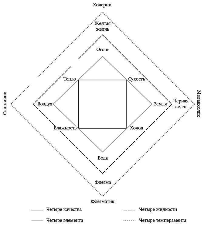 Рис. 2.2. Четыре жидкости, элемента, качества и темперамента в парадигме гуморальной медицины (адаптация Билла Нельсона)