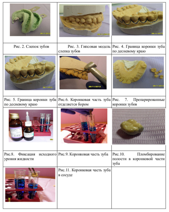 3. Коронковая часть зуба помещается в мерный сосуд, заполненный жидкостью. Предварительно фиксируется исходный уровень жидкости V0, после погружения коронковой части зуба определяется уровень – V1. Разница V1-V0 = Vx – объем коронки после препарирования (рис. 8,9).