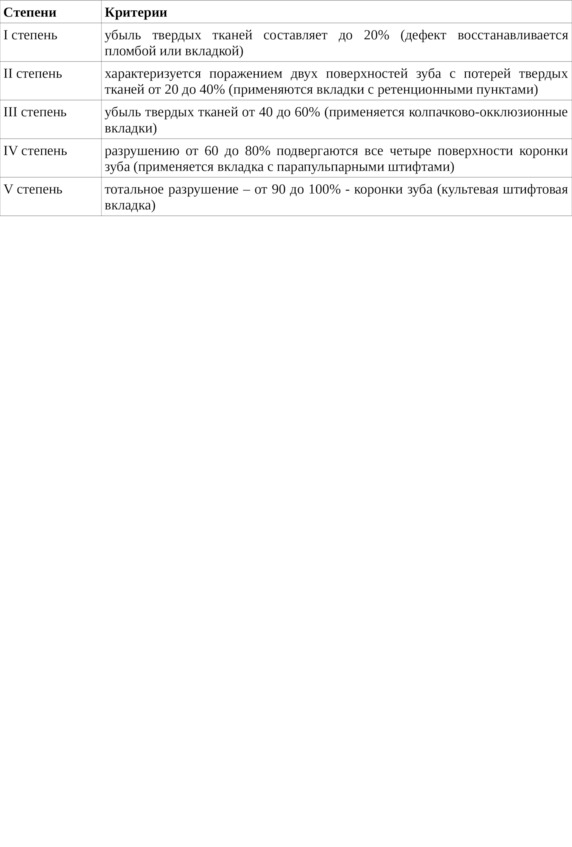 В 1991 г. Рогожников Г. И. предложил проводить выбор восстановительной реконструкции вкладкой, учитывая степень потери твердых тканей зуба и в зависимости от топографии дефекта, что позволяет наиболее оптимально выбирать вариант конструкций вкладок. Автор различает пять степеней разрушения коронки зуба в зависимости от количества пораженных поверхностей коронки зуба: