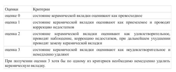 Способ позволяет провести точную оценку состояния керамических вкладок для своевременного принятия мер для исправления выявленных недостатков за счет проведения оценки по оценочной шкале и проведение анализа каждого из критерия отдельно.