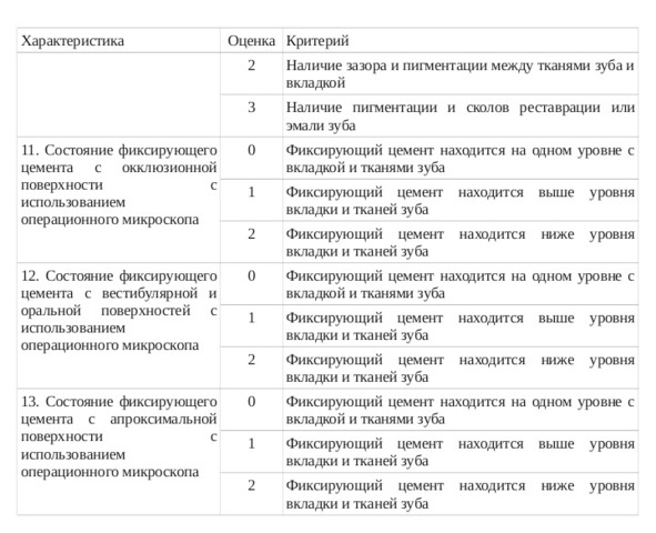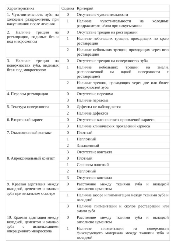 Оценивают чувствительность зуба после лечения, наличие трещин на керамической вкладке и на поверхностях тканей зуба, видимых с использованием операционного микроскопа и без применения специальных средств, наличие перелома реставрации, текстуру поверхности, появление вторичного кариеса, окклюзионный и апроксимальный контакты, краевую адаптацию между вкладкой, цементом и эмалью зуба, состояние фиксирующего цемента. Оценку проводят по оценочной шкале. Каждый из критериев анализируют отдельно.