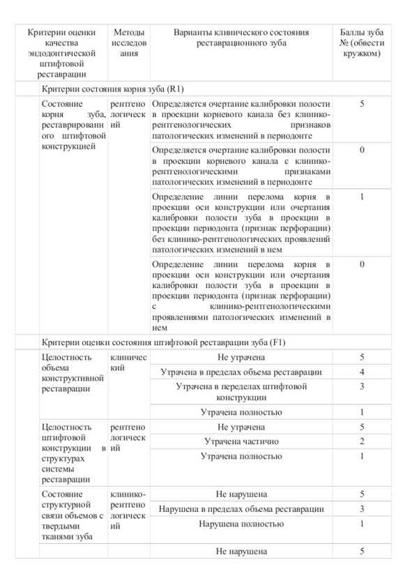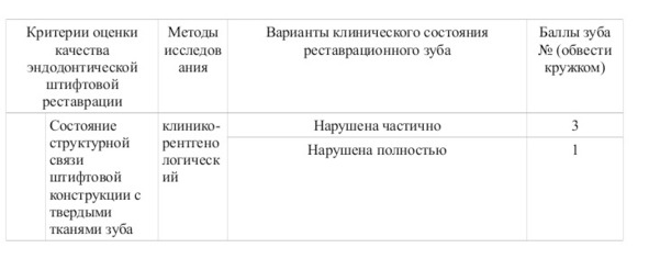 Карта бальной оценки клинического состояния штифтовой реставрации зуба