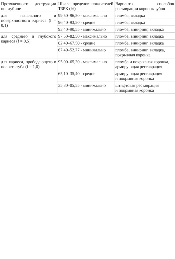 По представленной ниже табл. 1 показателей максимальных, средних и минимальных пределов индексов ТЗРК осуществляют выбор метода реставрации коронки зуба. В данном случае критерием для выбора метода реставрации зуба является попадание полученного числового значения ТЗРК в промежуток показателей процентных индексов ТЗРК (табл. 1), что способствует достоверному обоснованию принимаемых лечебных мер.