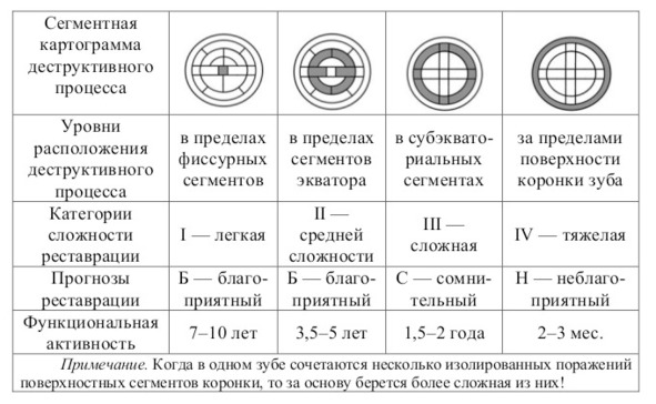 В сравнении с данными табл. 2 устанавливают категорию сложности деструктивного процесса и прогноза конечных результатов реставрации по уровню его расположения на поверхностных сегментах коронки зубов.