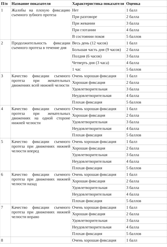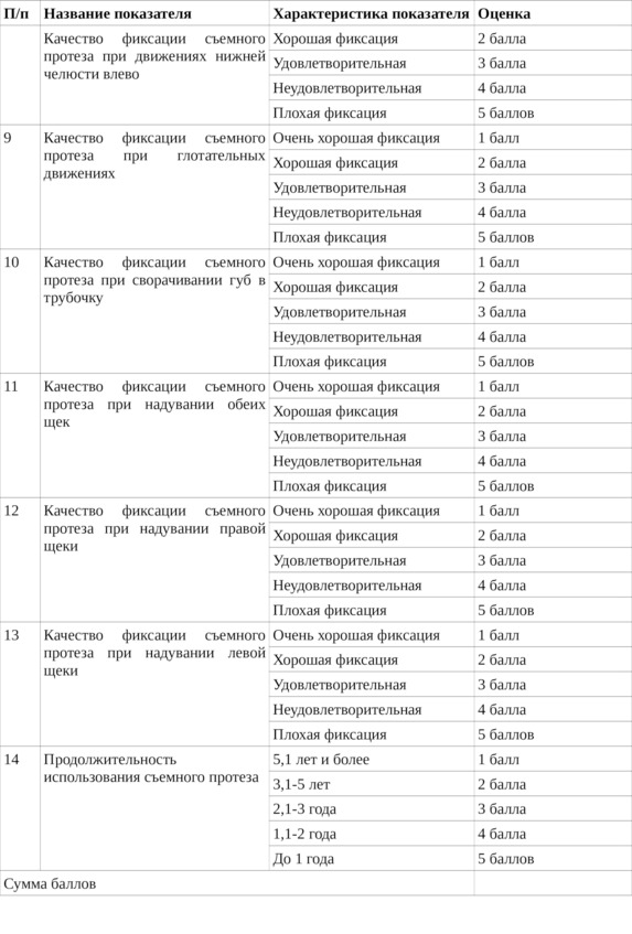 Для определения индекса фиксации съёмного зубного протеза С. Б. Улитовского-А. А. Леонтьева проведено анкетирование пациентов по 14 критериям.