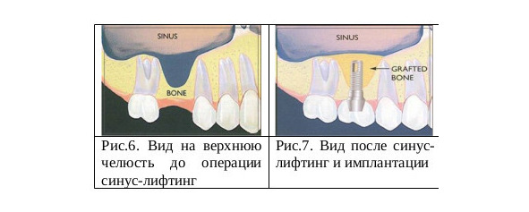 Синус-лифтинг (субантральная аугментация), то есть наращивание костной ткани, в случае если её недостаточно для вживления зубного имплантата (импланта) (Рис.6—7).