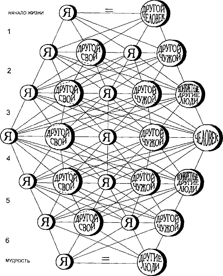 Предлагаемая в практикуме теоретическая позиция является попыткой реализовать культурно-историческую теорию Л. С. Выготского применительно к решению вопроса о содержании «зоны ближайшего развития», которая представляет собой взаимодействие человека с другими людьми (концепция другого человека) и с самим собой (Я-концепция). Качественные изменения в содержании взаимодействия человека с другими людьми в разные возрастные периоды жизни человека позволяют характеризовать их как проявление изменений в концепции Другого человека и Я-концепции. Однако обе концепции являются необходимыми элементами психической реальности и обеспечивают ее существование (см. рис. 1 «Строение психической реальности»). В разные периоды жизни человека степень дифференциации Я-концепции и концепции Другого человека является разной, что позволяет выделять качественно своеобразные периоды в жизни человека (1–6 на схеме), объединенные, однако, наличием Я и других людей, а также отношением между ними. Развитие концепции Другого человека предполагает установление психологической дистанции по признаку дифференциации других людей на своих, близких и чужих, далеких. Этот признак дифференцированности наполняется конкретным содержанием за счет обогащения опыта взаимодействия с конкретными другими людьми и его обобщением. Кульминацией в развитии обобщенного знания о других людях является обобщение их сущностных характеристик в понятии «человек», которое в дальнейшей жизненной истории будет определять понимание конкретных других людей как своих и чужих, определять степень близости с ними как со своими или чужими.