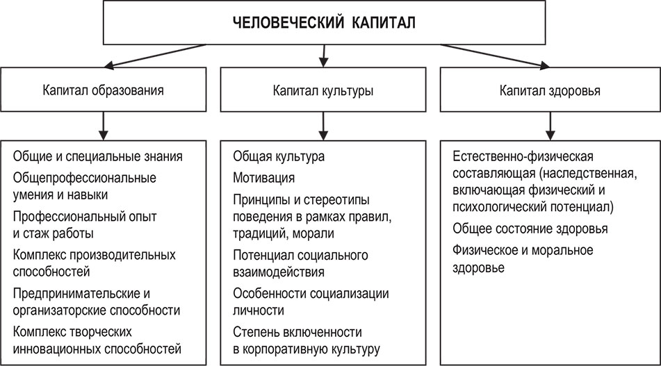 Человеческий капитал изучается по уровням формирования: микро-, мезо-, макро– (В. Т. Смирнов, И. В. Скоблякова и др.). При этом на индивидуальном уровне выделяют капитал здоровья, культурно-нравственный капитал, трудовой капитал, интеллектуальный капитал, предпринимательский капитал; на уровне фирмы – фирменные нематериальные активы, организационный капитал, структурный капитал; на национальном уровне – национальные интеллектуальные активы, национальные конкурентные преимущества.