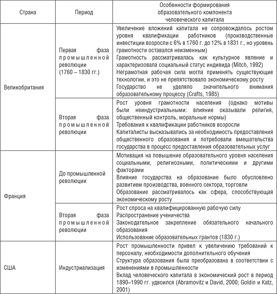 Таким образом, переход от одного этапа промышленной революции к другому сопровождался изменениями в формировании человеческого капитала: если изначально грамотность рассматривалась как культурное явление, низкий уровень образования не препятствовал использованию существующих технологий, а государство не уделяло внимания образовательному процессу, что выражалось в отсутствии законодательной и финансовой его поддержки, то на втором этапе ситуация была прямо противоположной.