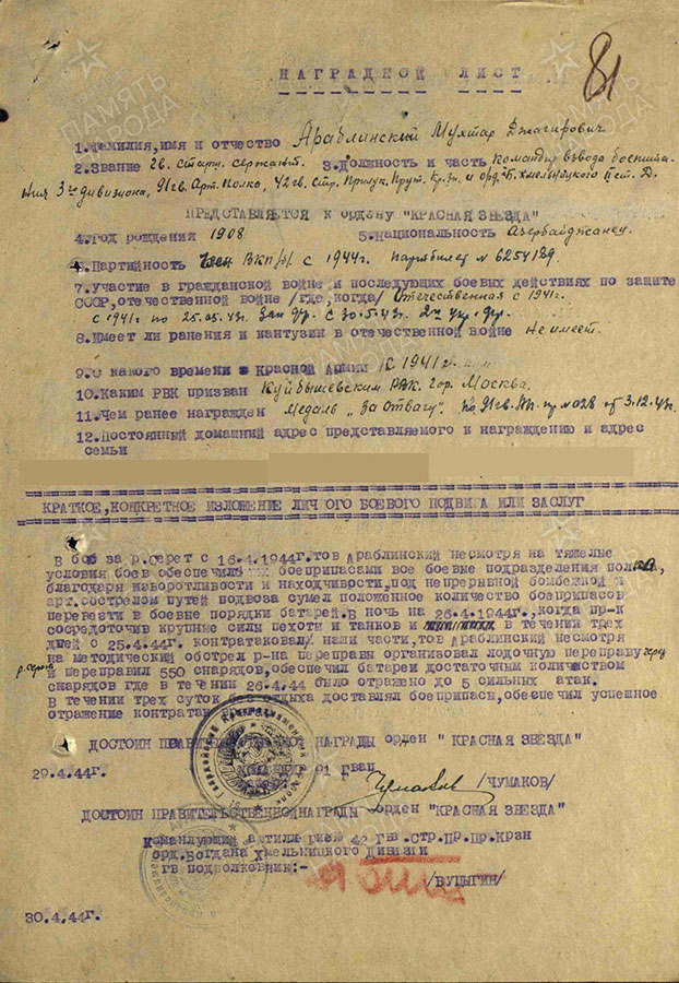 Наградной лист о представлении к правительственной награде – ордену Славы III степени ст. сержанта Араблинского Мухтара Джангировича, 1908 г. рожд., азербайджанца, призванного Куйбышевским РВК г. Москвы. 22 сентября 1944 г.