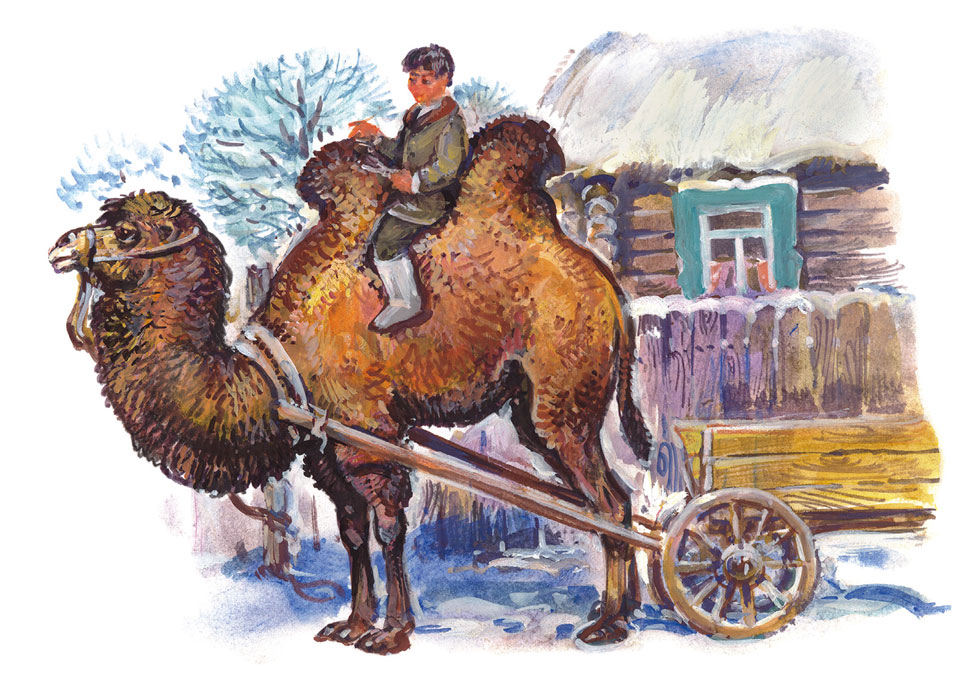 С одной подводы дрова выгрузили, верблюда вывели и привязали у забора. Большой такой, лохматый. Горбы высокие, как кочки на болоте, и набок свешиваются. Вся морда верблюда покрыта инеем, и губами он что-то всё время жуёт – наверное, хочет плюнуть.