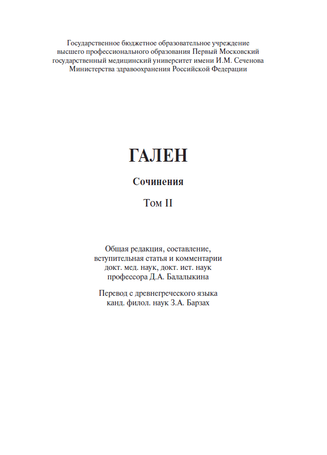 При подготовке этого издания мы постарались достаточно полно проанализировать и раскрыть взгляды Галена как врача: его подходы к общей патологии и основные принципы учения о разновидностях заболеваний. Первый том, вышедший в 2014 году, был составлен из трактатов, анализ которых показывал взгляды Галена как философа. Это требовалось для раскрытия фундаментальных основ его исследовательской программы. В нем был сделан акцент на учении Галена о единстве духовного и телесного в организме как основополагающем для зарождения и развития медицины в виде целостной системы знаний. Представления великого римского врача о философии здоровья и болезни, на наш взгляд, должны были в первую очередь стать доступны российскому читателю. Существовала также необходимость исправить некоторые наиболее грубые ошибки, допущенные в отечественной историографии в отношении понимания значения наследия Галена в истории медицины. Если судить по реакции научного сообщества, которую вызвала публикация первого тома «Сочинений», задача была выполнена.