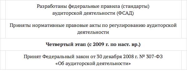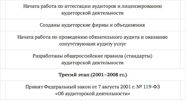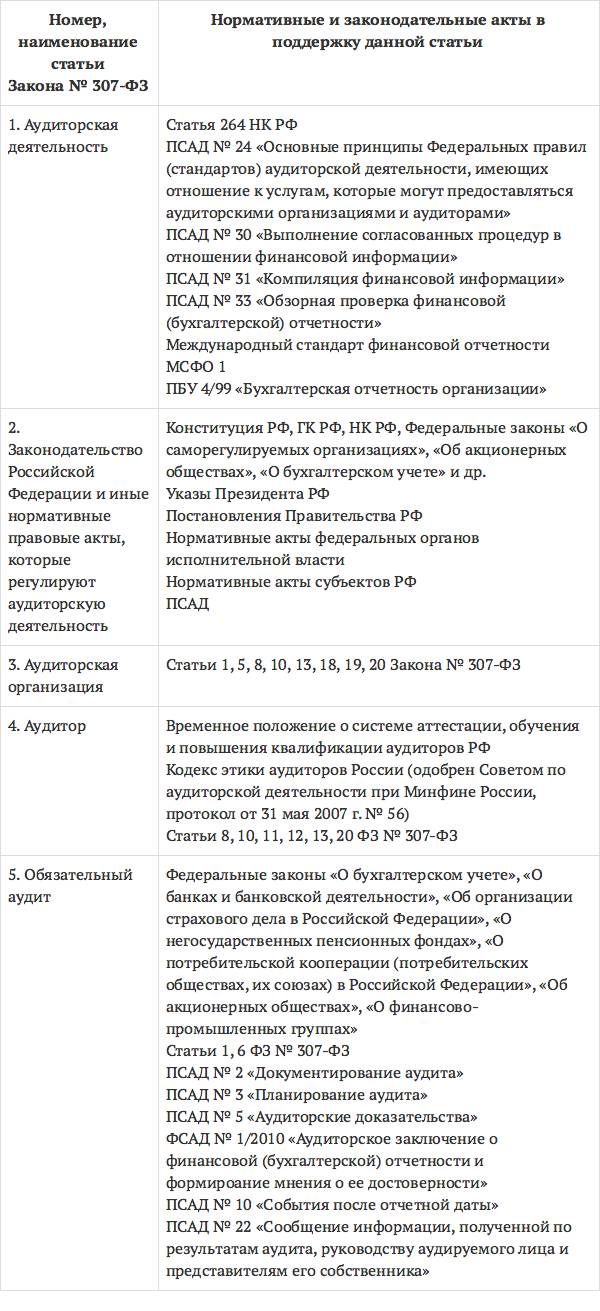 Основным законодательным актом, регулирующим аудиторскую деятельность в России, является Федеральный закон «Об аудиторской деятельности». В 2001 г. был принят и вступил в силу Федеральный закон от 7 августа 2001 г. № 119-ФЗ «Об аудиторской деятельности». Он подтвердил окончательное становление аудита в России, обобщил весь существующий опыт аудиторской деятельности в рыночной экономике применительно к российским традициям и действующему в России гражданскому и финансовому праву. Это закон прямого действия, устанавливающий правовые основы аудиторской деятельности. После принятия Федерального закона «Об аудиторской деятельности» № 119-ФЗ шло дальнейшее интенсивное развитие системы российского аудита, в связи с чем в Закон периодически вносились поправки. В 2008 г. был принят новый Федеральный закон от 30 декабря 2008 г. № 307-ФЗ «Об аудиторской деятельности», который вступил в силу в большей своей части с 1 января 2009 г.