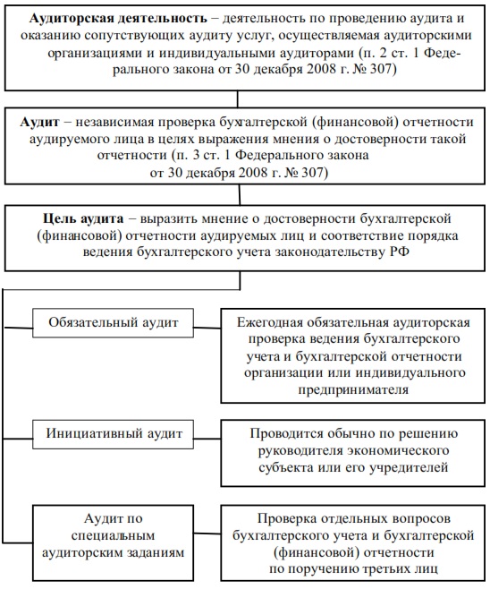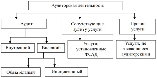 Аудиторская деятельность в соответствии с Федеральным законом от 30 декабря 2008 г. № 307-ФЗ включает два компонента: аудит и сопутствующие аудиту услуги. Аудиторы могут оказывать также прочие услуги, не являющиеся аудиторскими. Основным видом аудиторской деятельности является аудит.