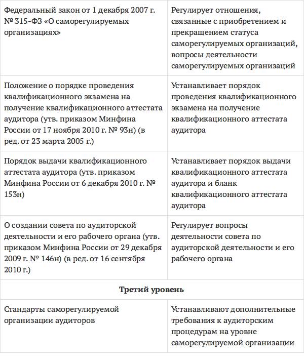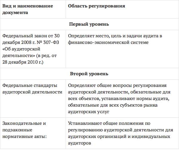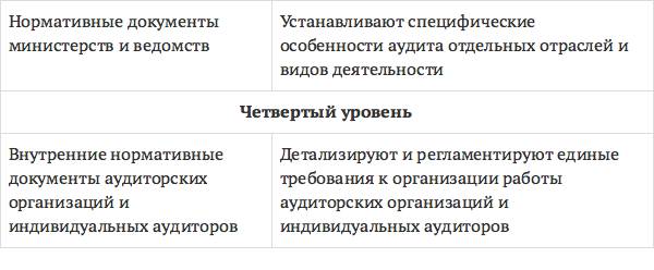 В соответствии с принятой концепцией нормативного регулирования аудита в России построена четырехуровневая система его регламентации. Каждый уровень включает определенные виды документов, область регулирования и степень разработанности нормативной документации.
