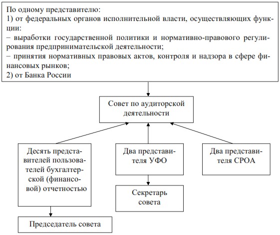 В целях обеспечения общественных интересов в ходе осуществления аудиторской деятельности при уполномоченном федеральном органе создается совет по аудиторской деятельности. На первом заседании совета избирается председатель совета. Председатель избирается из представителей пользователей бухгалтерской (финансовой) отчетности, входящих в состав совета. Секретарем совета по аудиторской деятельности является представитель уполномоченного федерального органа из числа членов совета.