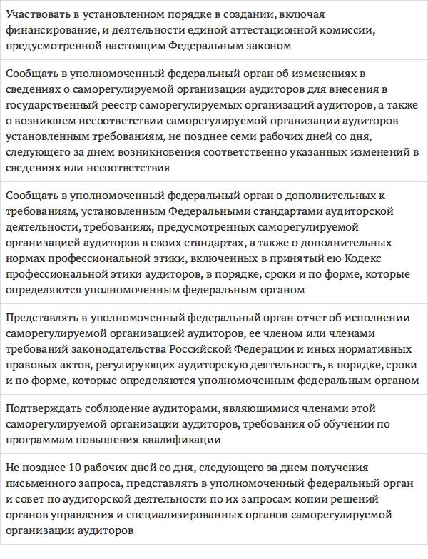 Некоммерческая организация приобретает статус саморегулируемой организации аудиторов с даты ее включения в государственный реестр саморегулируемых организаций аудиторов. Представители уполномоченного федерального органа и совета по аудиторской деятельности вправе присутствовать на собраниях (заседаниях) органов управления и специализированных органов саморегулируемой организации аудиторов, а также на иных проводимых ею мероприятиях.