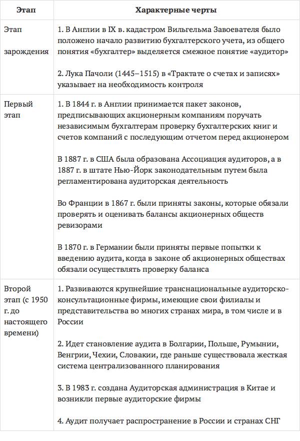 Аудиторская деятельность прошла определенный путь в своем развитии, начиная со стихийного зарождения отдельных разрозненных элементов этого вида контроля до формирования целостной отрасли научной и практической деятельности. Условно можно выделить три этапа развития аудита: период зарождения и два этапа его становления. Родиной аудита считается Англия.