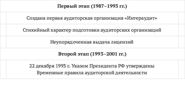 В России начиная с конца XIX в. было сделано несколько попыток введения системы аудита (1889, 1912, 1928 гг.). Все они оказались неудачными. Формирование в России рыночных отношений послужило толчком к очередной попытке организации аудиторской деятельности.