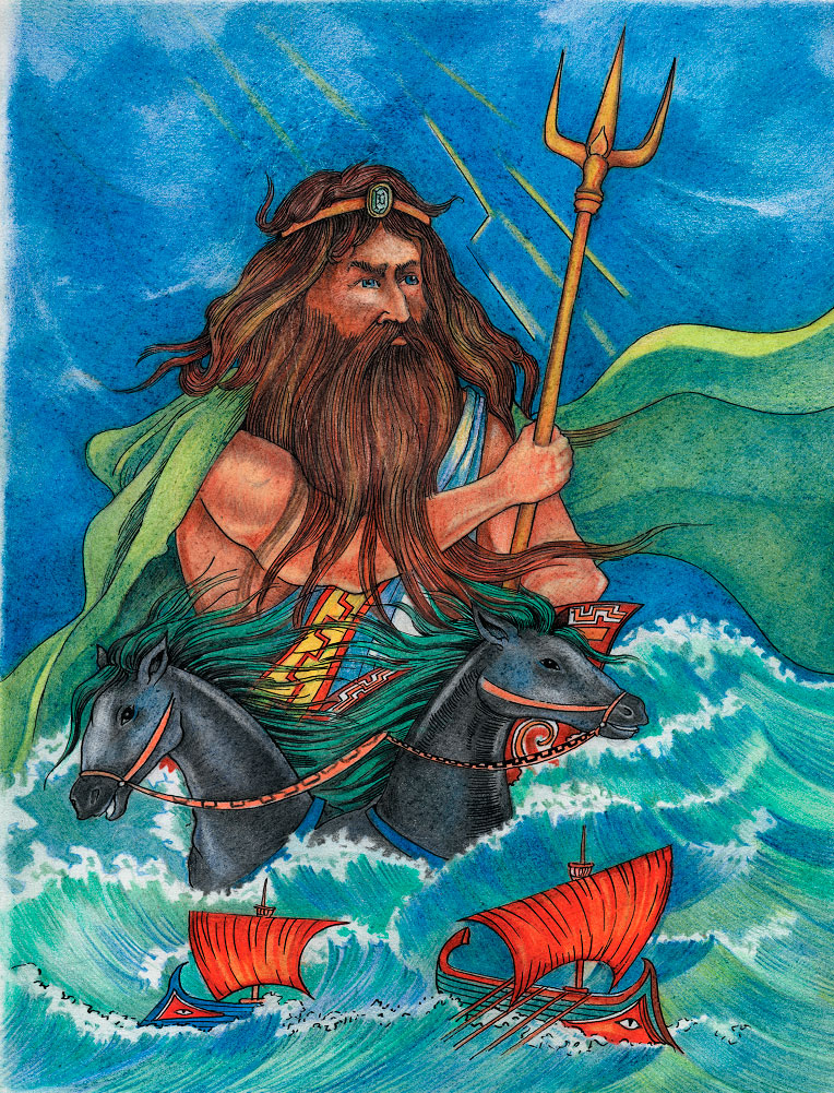 Страшен могучий Посейдон в гневе, и горе тому, кто окажется в такое время на море. Словно невесомые щепки, носятся по бушующим волнам огромные корабли, пока, вконец изломанные и искореженные, не рухнут они в морскую пучину. Даже морские обитатели – рыбы и дельфины – стараются забраться поглубже в море, чтобы переждать там в безопасности гнев Посейдона.