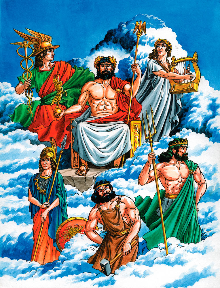 Сидит великий Зевс на золотом троне, а перед ним в просторном зале разместились все остальные боги. Возле его трона, как всегда, богиня мира Эйрена и постоянная спутница Зевса крылатая Ника, богиня победы. Здесь же и быстроногий Гермес, посланец Зевса, и великая богиня-воительница Афина Паллада. Сияет своей небесной красотой прекрасная Афродита.