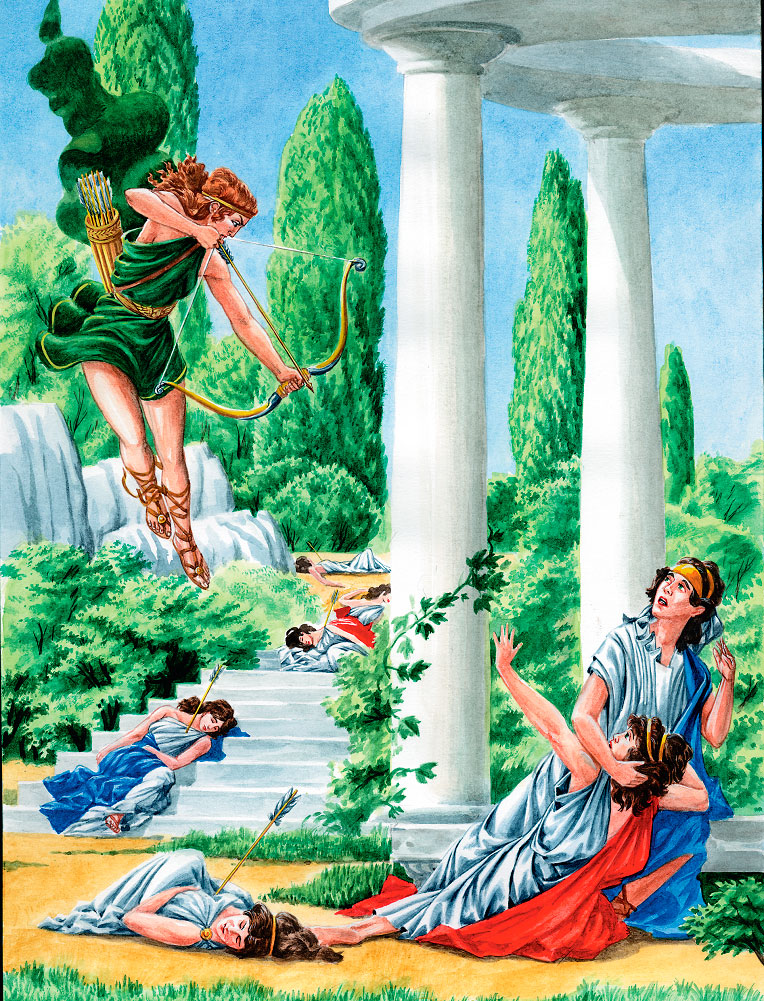 – Тяжело оскорбила меня гордая Ниоба. Она не верит, что я великая богиня и что только самой Гере уступаю я в своем могуществе. Неужели вы, мои дети, не отомстите за меня? Ведь если вы этого не сделаете, люди перестанут почитать меня и разрушат все мои алтари. Она и вас оскорбила тоже. Вас, бессмертных богов, она посмела равнять со своими смертными детьми.